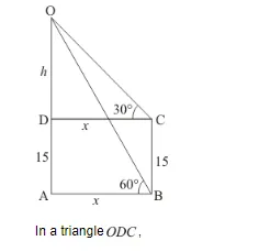 $\Rightarrow \quad \tan 60^{\circ}=\frac{h+15}{x}$