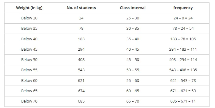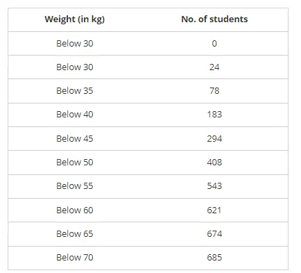 Given below are the cumulative frequencies showing the weights of 685 students of a school. Prepare a frequency distribution table.