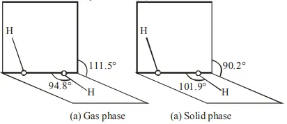 (a) $\mathrm{H}_{2} \mathrm{O}_{2}$ structure in gas phase, dihedral angle is $111.5^{\circ}$. (b) $\mathrm{H}_{2} \mathrm{O}_{2}$ structure in solid phase at $110 \mathrm{~K}$, dihedral angle is $90.2^{\circ}$.