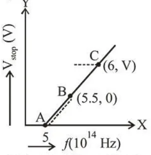 $\therefore \phi=\frac{6.62 \times 10^{-34} \times 5.5 \times 10^{14}}{1.6 \times 10^{-19}} \mathrm{eV}=2.27 \mathrm{eV}$