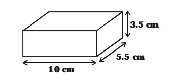 $\therefore$ Volume $=\ell \times \mathrm{b} \times \mathrm{h}=10 \times \frac{\mathbf{5 5}}{\mathbf{1 0}} \times \frac{\mathbf{3 5}}{\mathbf{1 0}} \mathrm{cm}^{3}$