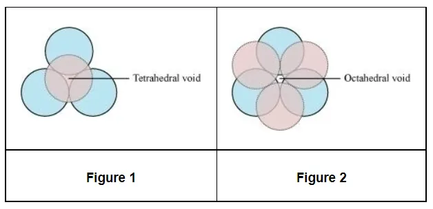 (iii) A void surrounded by 4 spheres is called a tetrahedral void and a void surrounded by 6 spheres is called an octahedral void. Figure 1 represents a tetrahedral void and figure 2 represents an octahedral void.