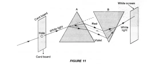 - Place a card board in front of a prism A. A ray of white light coming from the hole in the card board falls on the prism A (Figure 11).