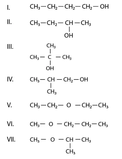 I and V, I and VI, I and VII, II and V, II and VI, II and VII, III and V, III and VI, III and VII, IV and V, IV and VI, IV and VII. Alcholol is the function group of each ether in the given seven compounds.