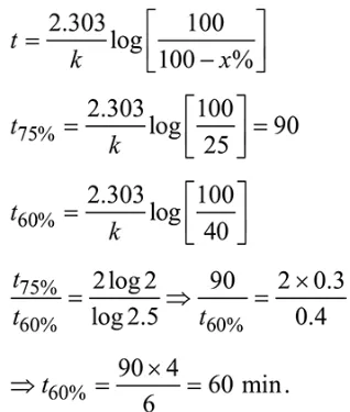 If $75 \%$ of a first order reaction was completed in 90 minutes, $60 \%$ of the same reaction would be completed in approximately (in minutes) ______________