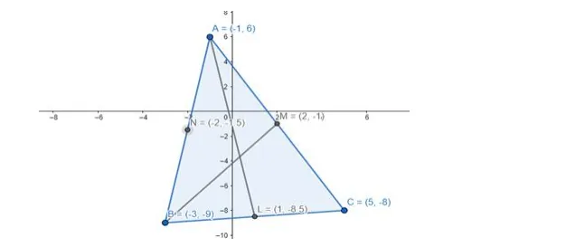 coordinates of $L=\left(\frac{-3+5}{2}, \frac{-9+(-8)}{2}\right) \Rightarrow\left(1, \frac{-17}{2}\right)$