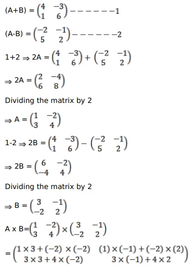 $(A+B)=\left(\begin{array}{cc}4 & -3 \\ 1 & 6\end{array}\right)$ and $(A-B)=\left(\begin{array}{cc}-2 & -1 \\ 5 & 2\end{array}\right)$ then $A B=?$