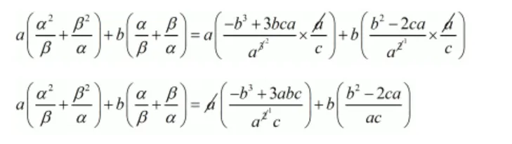 $a\left(\frac{\alpha^{2}}{\beta}+\frac{\beta^{2}}{\alpha}\right)+b\left(\frac{\alpha}{\beta}+\frac{\beta}{\alpha}\right)=a\left(\frac{\left(\frac{-b}{a}\right)^{3}-3 \times \frac{c}{a}\left(\frac{-b}{a}\right)}{\frac{c}{a}}\right)+b\left(\frac{\left(\frac{-b}{a}\right)^{2}-2 \times \frac{c}{a}}{\frac{c}{a}}\right)$