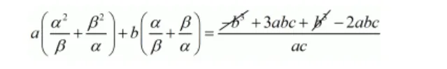 $a\left(\frac{\alpha^{2}}{\beta}+\frac{\beta^{2}}{\alpha}\right)+b\left(\frac{\alpha}{\beta}+\frac{\beta}{\alpha}\right)=\frac{3 a b c-2 a b c}{a c}$