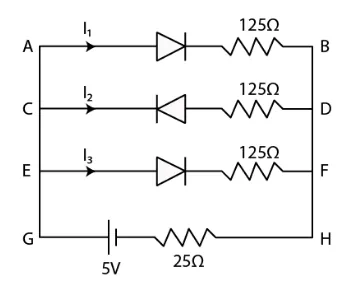 If each diode in the figure has a forward bias resistance of 25Ω and infinite resistance in reverse bias, what will be the values of the current I1, I2, I3 and I4?