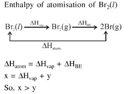 Question: If enthalpy of atomisation for $\mathrm{Br}_{2(1)}$ is $x \mathrm{~kJ} / \mathrm{mol}$ and bond enthalpy for $\mathrm{Br}_{2}$ is $\mathrm{y} \mathrm{kJ} / \mathrm{mol}$, the relation between them :