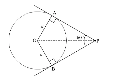 Let $\mathrm{PA}$ and $\mathrm{PB}$ be the two tangents drawn to the circle with centre $\mathrm{O}$ and radius a such that $\angle \mathrm{APB}=60^{\circ}$.