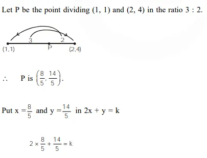 Question: If the line $2 \mathrm{x}+\mathrm{y}=\mathrm{k}$ passes through the point which divides the line segment joining the points $(1,1)$ and $(2,4)$ in the ratio $3: 2$, then $\mathrm{k}$ equals :