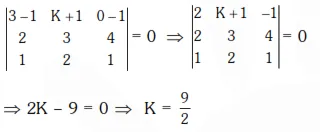 Question: If the lines $\frac{\mathrm{x}-1}{2}=\frac{\mathrm{y}+1}{3}=\frac{\mathrm{z}-1}{4}$ and $\frac{\mathrm{x}-3}{1}=\frac{\mathrm{y}-\mathrm{k}}{2}=\frac{\mathrm{z}}{1}$ intersect, then $\mathrm{k}$ is equal to :