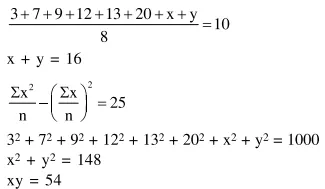 If the mean and variance of eight numbers $3,7,9,12,13,20, x$ and $y$ be 10 and 25 respectively, then $x \cdot y$ is equal to______