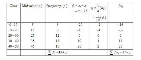 Now, we have $\sum f_{i}=43+p, \sum f_{i} u_{i}=17-p, h=10$ and $A=25$