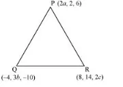 If the origin is the centroid of the triangle PQR with vertices P (2a, 2, 6), Q (–4, 3b, –10) and R (8, 14, 2c), then find the values of a, b and c.