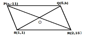 If the points P(a, −11), Q(5, b), R(2, 15) and S(1, 1) are the vertices of a parallelogram PQRS, find the values of a and b.