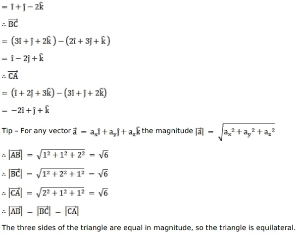 Question: If the position vectors of the vertices $A, B$ and $C$ of a $\triangle A B C$ be $(\hat{i}+2 \hat{j}+3 \hat{k}),(2 \hat{i}+3 \hat{j}+\hat{k})$ and $(3 \hat{i}+\hat{j}+2 \hat{k})$ respectively, prove that $\triangle A B C$ is equilateral.