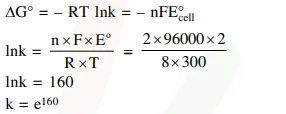 If the standard electrode potential for a cell is $2 \mathrm{~V}$ at $300 \mathrm{~K}$, the equilibrium constant (K) for the reaction