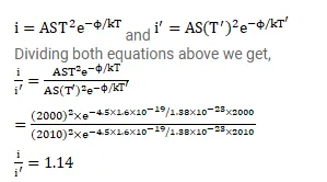 If the temperature of a tungsten filament is raised from $2000 \mathrm{~K}$ to $2010 \mathrm{~K}$, by what factor does the emission current change? Work function of tungsten is $4.5 \mathrm{eV}$.