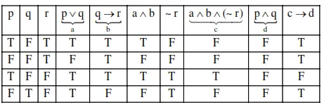 If the truth value of the Boolean expression $((\mathrm{p} \vee \mathrm{q}) \wedge(\mathrm{q} \rightarrow \mathrm{r}) \wedge(\sim \mathrm{r})) \rightarrow(\mathrm{p} \wedge \mathrm{q}) \quad$ is $\quad$ false then the truth values of the statements $\mathrm{p}, \mathrm{q}, \mathrm{r}$ respectively can be: