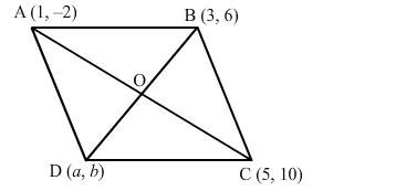 Let A(1, −2), B(3, 6) and C(5, 10) be the three vertices of a parallelogram ABCD and the fourth vertex be D(a, b).