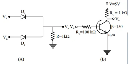 If $\mathrm{V}_{\mathrm{A}}$ and $\mathrm{V}_{\mathrm{B}}$ are the input voltages (either $5 \mathrm{~V}$ or $0 \mathrm{~V}$ ) and $\mathrm{V}_{\mathrm{o}}$ is the output voltage then the two gates represented in the following circuit (A) and (B) are:-