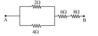 $6 \Omega$ and $8 \Omega$ are in parallel with $2 \Omega$ and $4 \Omega$ in series