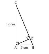 Given: In $\triangle \mathrm{ABC} \angle \mathrm{A}=90^{\circ}, \mathrm{AD} \perp \mathrm{BC}, \mathrm{AC}=12 \mathrm{~cm}$, and $\mathrm{AB}=5 \mathrm{~cm}$.