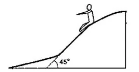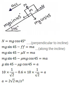 In a children-park an inclined plane is constructed with an angle of incline $45^{\circ}$ in the middle part. Find the acceleration of a boy sliding on it if the friction coefficient between the cloth of the boy and the incline is $0.6$ and $\mathrm{g}=10 \mathrm{~m} / \mathrm{s}^{2}$.