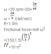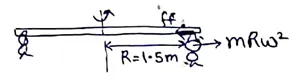 In a children's park a heavy rod is pivoted at the centre and is made to rotate about the pivot so that the rod always remains horizontal. Two kids hold the rod near the ends and thus rotate with the rod (figure 7-E2). Let the mass of each kid be $15 \mathrm{~kg}$, the distance between the points of the rod where the two kids hold it be $3.0 \mathrm{~m}$ and suppose that the rod rotates at the rate of 20 revolutions per minute. Find the force of friction exerted by the rod on one of the kids.