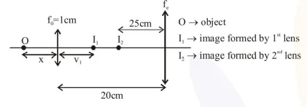 for first lens $=\frac{1}{v_{1}}-\frac{1}{-x}=\frac{1}{1} \Rightarrow v_{1}=\frac{x}{x-1}$
