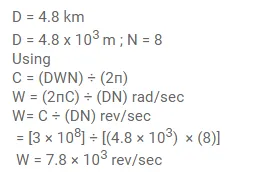 In a Michelson experiment for measuring speed of light, the distance travelled by light between two reflections from the rotating mirror is $4.8 \mathrm{~km}$. The rotating mirror has a shape of a regular octagon. At what minimum angular speed of the mirror (other than zero) the image is formed at the position where a non-rotating mirror forms it?