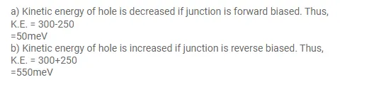 In a p-n junction, a potential barrier of $250 \mathrm{meV}$ exists across the junction. A hole with a kinetic energy of $300 \mathrm{meV}$ approaches the junction. Find the kinetic energy of the hole when it crosses the junction if the hole approached the junction