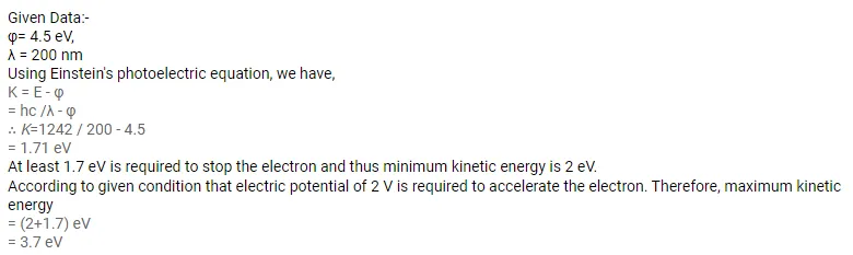 In a photoelectric experiment, the collector plate is at $2.0 \mathrm{~V}$ with respect to the emitter plate made of copper $(\varphi=4.5 \mathrm{eV})$. The emitter is illuminated by a source of monochromatic light of wavelength $200 \mathrm{~nm}$. Find the minimum and maximum kinetic energy of the photoelectrons reaching the collector.