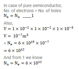 In a pure semiconductor, the number of conduction electrons is $6 \times 10^{19} \mathrm{Per}$ cubic mertre. How many holes are there in a sample of size $1 \mathrm{~cm} \times 1 \mathrm{~cm} \times 1 \mathrm{~cm}$ ?