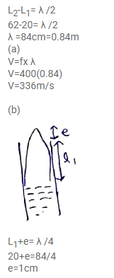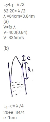 In a resonance column experiment, a tuning fork of frequency $400 \mathrm{~Hz}$ is used. The first resonance is observed when the air column has a length of $20.0 \mathrm{~cm}$ and the second resonance is observed when the air column has a length of $62.0 \mathrm{~cm}$.