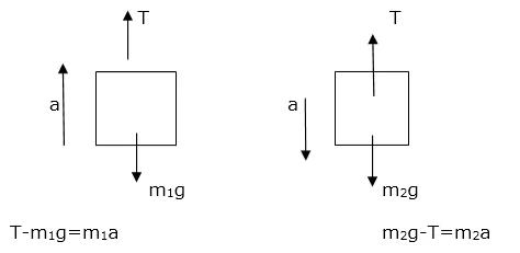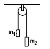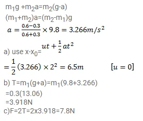 In a simple Atwood machine, two unequal masses $\mathrm{m} 1$, and $\mathrm{m} 2$ are connected by a string going over a clamped light smooth pulley. In a typical arrangement $\mathrm{m} 1=300 \mathrm{~g}$ and $\mathrm{m} 2=600 \mathrm{~g}$. The system is released from rest. (a) Find the distance travelled by the first block in the first two seconds. (b) Find the tension in the string. (c) Find the force exerted by the clamp on the pulley.