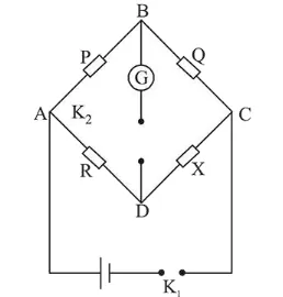 In a Wheatstone bridge (see fig.), Resistances $P$ and $Q$ are approximately equal. When $\mathrm{R}=400 \Omega$, the bridge is balanced. On interchanging $P$ and $Q$, the value of $R$, for balance, is $405 \Omega$. The value of $\mathrm{X}$ is close to: