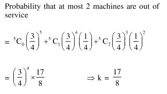 service on a day is $\frac{1}{4}$. If the probability that at most two machines will be out of service on the same day is $\left(\frac{3}{4}\right)^{3} \mathrm{k}$, then $\mathrm{k}$ is equal to :