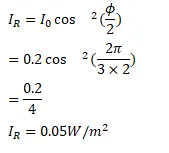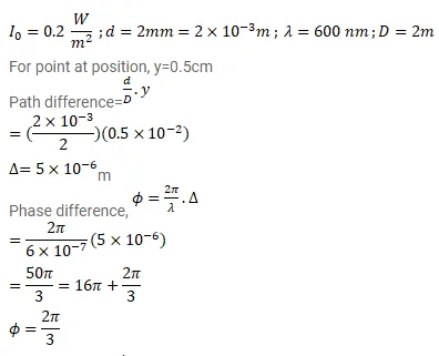 In a Young's double slit experiment, the separation between the slits $=2.0 \mathrm{~mm}$, the wavelength of the light=600 $\mathrm{nm}$ and the distance of the screen from the slits $=2.0 \mathrm{~m}$. If the intensity at the centre of the central maximum is $0.20 \mathrm{~W} / \mathrm{m}^{2}$, what will be the intensity at a point $0.5 \mathrm{~cm}$ away from this centre along the width of the fringes?