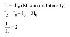 In a Young's double slit experiment, the two slits act as coherent sources of waves of equal amplitude A and wavelength $\lambda$. In another experiment with the same arrangement the two slits are made to act as incoherent sources of waves of same amplitude and wavelength. If the intensity at the middle point of the screen in the first case is $\mathrm{I}_{1}$ and in the second case $\mathrm{I}_{2}$, then the ratio $\frac{\mathrm{I}_{1}}{\mathrm{I}_{2}}$ is :-