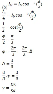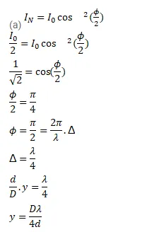 In a Young's double slit interference experiment the fringe pattern is observed on a screen placed at a distance $D$ from the slits. The slits are separated by a distance $d$ and are illuminated by monochromatic light of wavelength $\lambda$. Find the distance from the central point where the intensity falls to
