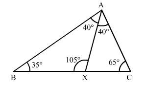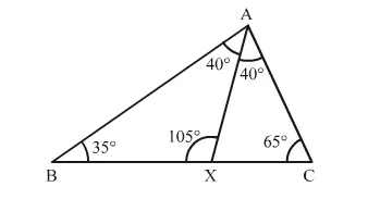 Given: In ΔABC, ∠B = 35°, ∠C = 65° and the bisector of ∠BAC meets BC in X.