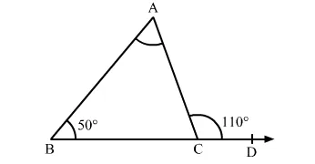 In ∆ABC, side BC is produced to D. If ∠ABC = 50° and ∠ACD = 110° then ∠A = ?