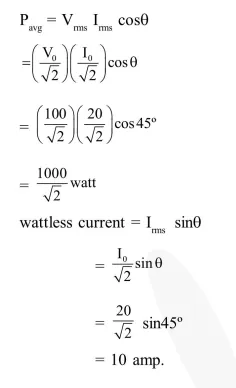 In an a. c. circuit, the instantaneous e.m.f. and current are given by e $=100 \sin 30 \mathrm{t} \mathrm{i}=20 \sin \left(30 \mathrm{t}-\frac{\pi}{4}\right)$ In one cycle of a.c., the average power consumed by the circuit and the wattless current are, respectively.