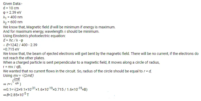 In an experiment on photoelectric effect, the emitter and the collector plates are placed at a separation of $10 \mathrm{~cm}$ and are connected through an ammeter without any cell. A magnetic field $B$ exists parallel to the plates. The work function of the emitter is $2.39 \mathrm{eV}$ and the light incident on it has wavelengths between $400 \mathrm{~nm}$ and $600 \mathrm{~nm}$. Find the minimum value of B for which the current registered by the ammeter is zero. Neglect any effect of space charge.