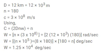 In an experiment to measure the speed of light by Fizeau's apparatus, following data are used: Distance between the mirrors $=12.0 \mathrm{~km}$, Number of teeth in the wheel $=180$. Find the minimum angular speed of the wheel for which the image is not seen.