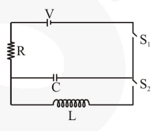 In an $L C R$ circuit as shown below both switches are open initially. Now switch $S_{1}$ is closed, $S_{2}$ kept open, ( $\mathrm{q}$ is charge on the capacitor and $\tau=\mathrm{RC}$ is Capacitive time constant). Which of the following statement is correct?